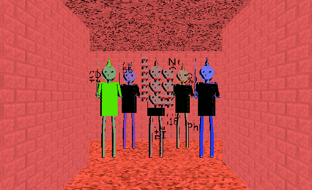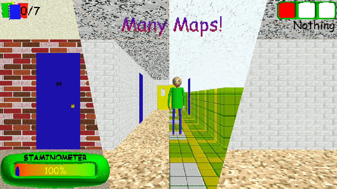 Multiplayer: Play with others as Baldi or as a student, and try to either collect all the notebooks and escape before school time ends, or try to catch all the students and make sure none escape. You will be able to join public and private rooms. Each round will have a countdown phase, 5 minutes of normal gameplay, and any time afterwards will start the time out section. The game won't end on its own during time out normally, but Baldi will start to pick up speed until the students escape or are all caught. If a student escapes, the time limit automatically is set to 1 minute and everyone must escape or else the time will run out and the game will end.