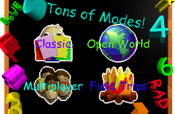 Field Trips: Go on field trips with Baldi and try to beat your high score. Complete objectives to get as many points as you can, or see how long you can last in certain trips. The field trips include the Camp, Farm, Water Treatment Plant, and Wild West.